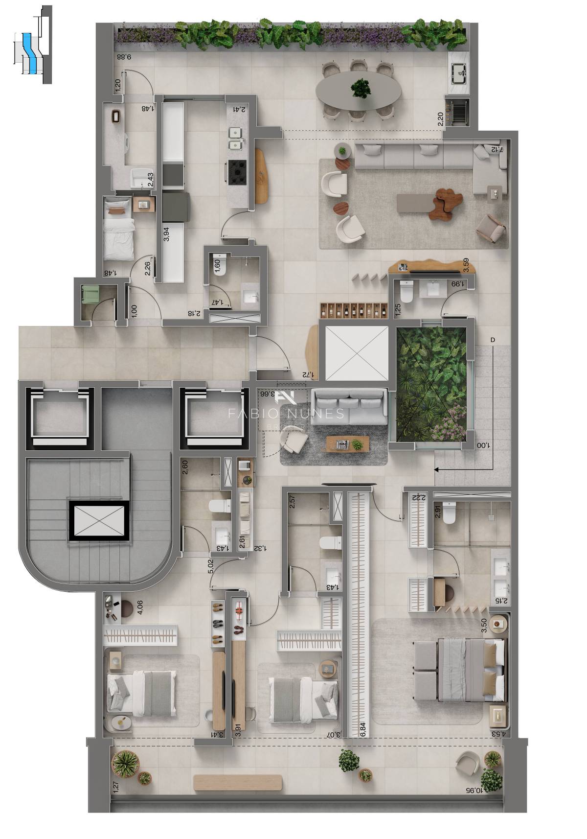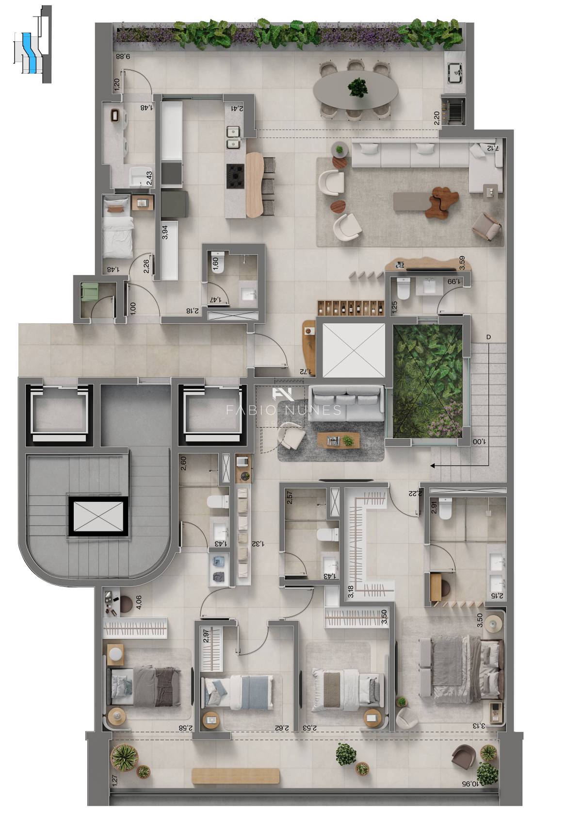 Com impressionantes 364,54m², o Insigna Penthouse oferece uma vida de alto padrão em um ambiente espaçoso, com 4 quartos (2 suítes) e opção para 3 suítes . O destaque vai para a piscina privativa com deck e a área gourmet com churrasqueira a carvão, além do pé-direito livre de 3,50m, que realça ainda mais a sensação de requinte e conforto.