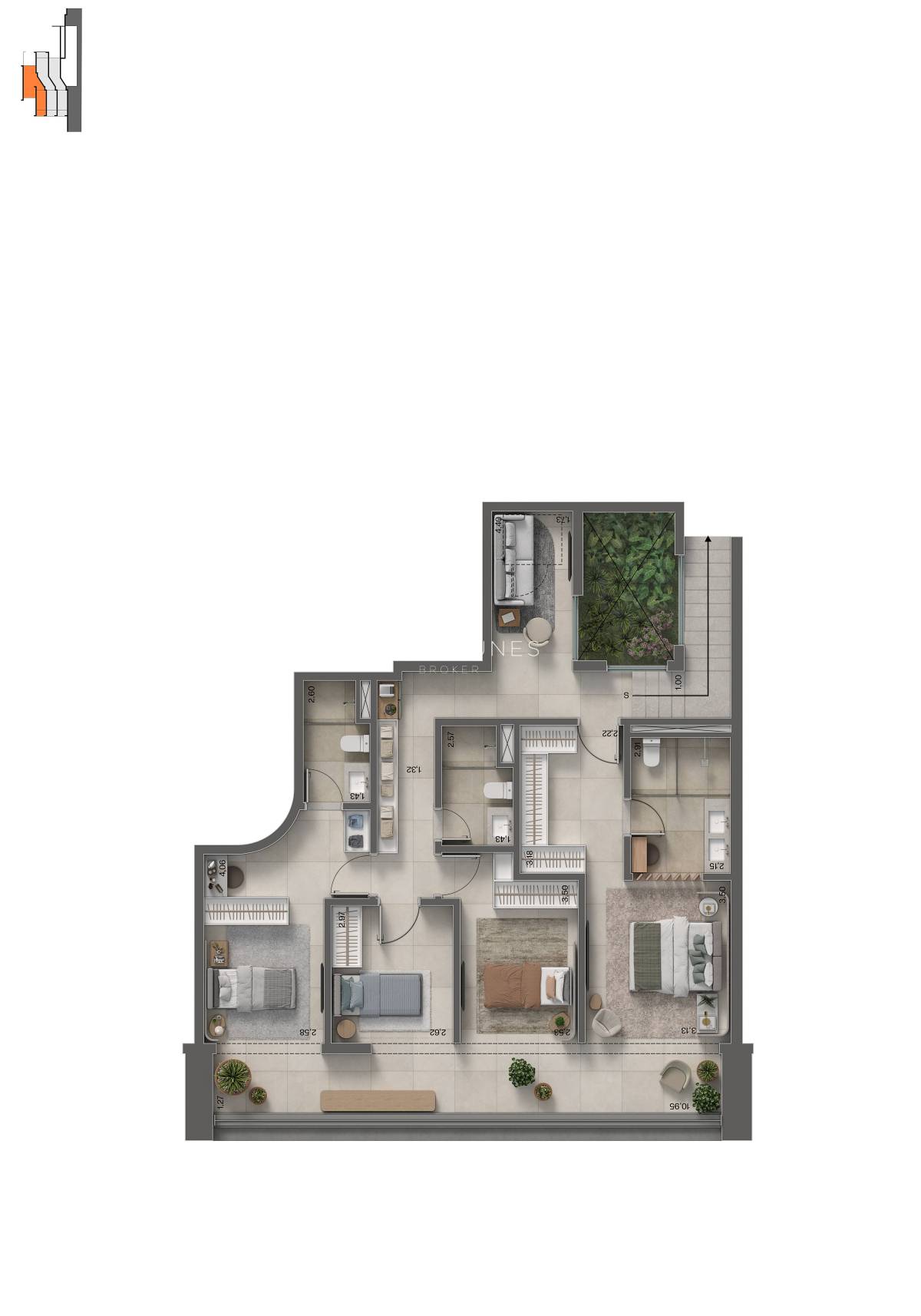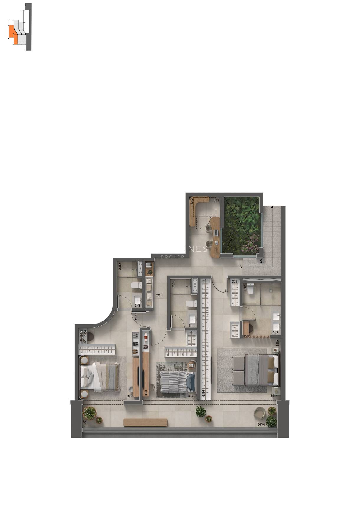 Com impressionantes 364,54m², o Insigna Penthouse oferece uma vida de alto padrão em um ambiente espaçoso, com 4 quartos (2 suítes) e opção para 3 suítes . O destaque vai para a piscina privativa com deck e a área gourmet com churrasqueira a carvão, além do pé-direito livre de 3,50m, que realça ainda mais a sensação de requinte e conforto.