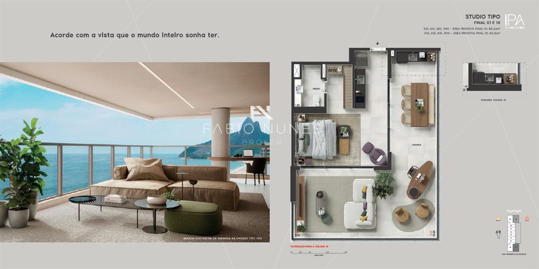 Com 190 unidades tipo studios, variando de 39m² a 111m², o Ipa Studios Design Ipanema oferece plantas que priorizam o conforto e a praticidade, características essenciais para quem busca um imóvel de luxo. São 180 apartamentos tipo, com metragens entre 39m² e 85m², e 10 apartamentos gardens, com áreas que vão de 49m² a 111m².