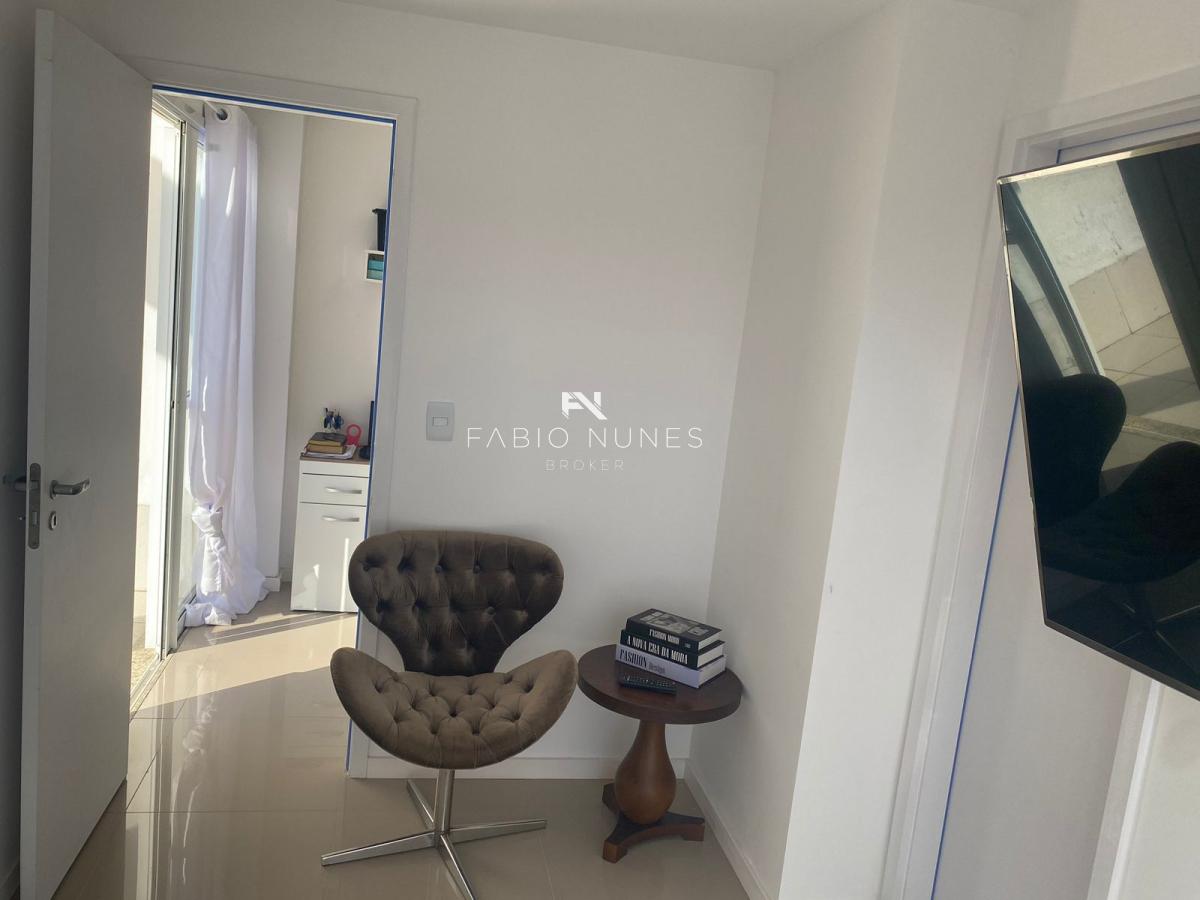 No pavimento superior, a suíte master oferece privacidade e conforto, acompanhada por um amplo terraço com vista deslumbrante para a área de lazer do condomínio e para as montanhas que cercam o Recreio. O espaço é ideal para momentos de contemplação e bem-estar.