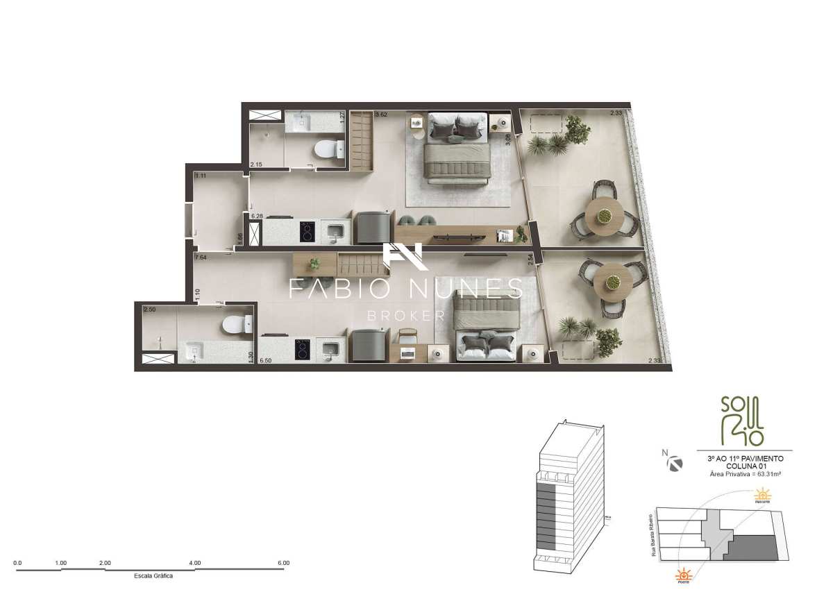 Área total de 63,30m² e 63,30m² de área útil.