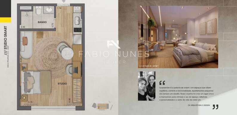 O Studio de 29,50 m², localizado em andar alto, oferece um formato inteligente que privilegia funcionalidade, bem-estar e praticidade. O layout foi planejado para otimizar cada metro quadrado, garantindo amplitude visual, integração dos ambientes, conforto térmico e preparação completa para ar-condicionado tipo split. O acabamento segue o padrão de qualidade Calçada & Montserrat, com piso vinílico na área social, porcelanato no banheiro, bancada em granito e rebaixo de gesso, criando um ambiente moderno e sofisticado.