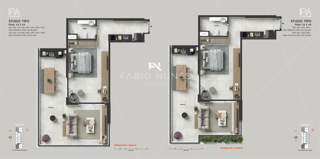 Com 190 unidades tipo studios, variando de 39m² a 111m², o Ipa Studios Design Ipanema oferece plantas que priorizam o conforto e a praticidade, características essenciais para quem busca um imóvel de luxo. São 180 apartamentos tipo, com metragens entre 39m² e 85m², e 10 apartamentos gardens, com áreas que vão de 49m² a 111m².